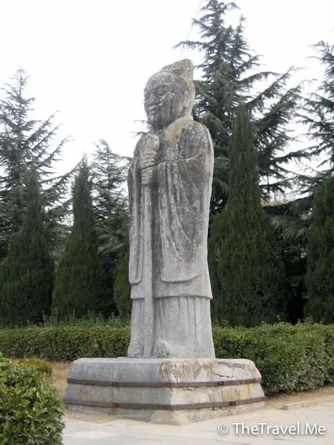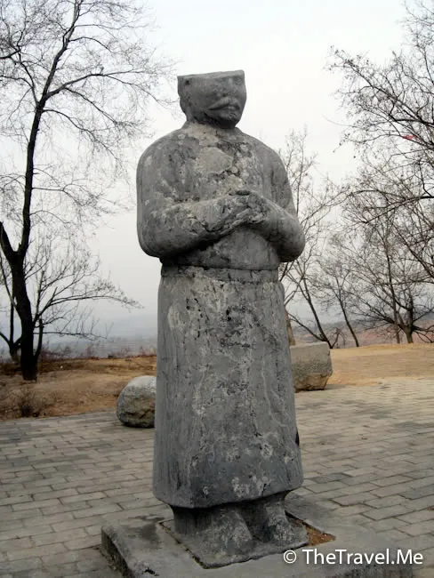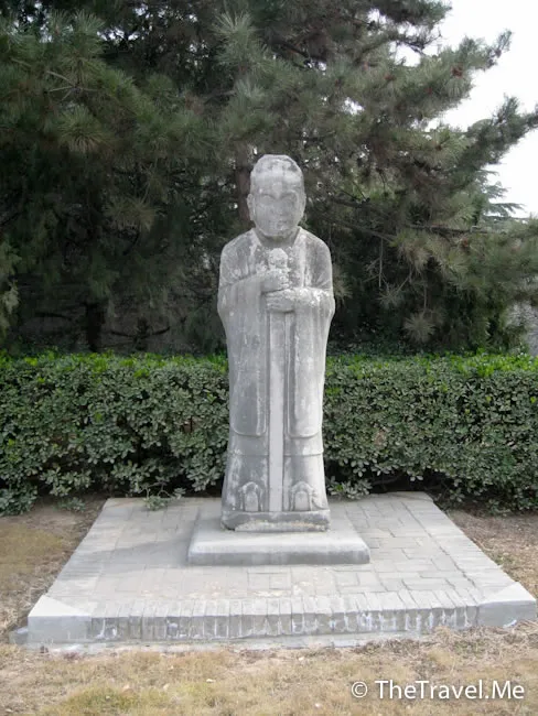 翁仲:陵墓前的石��又稱翁仲,對稱立有兩座,分別為文官和武官形象。關於翁仲的形象有一種說法是來源於秦朝有一位名叫阮翁仲的大力士,傳說他身長一丈三尺,力大無比,曾駐守臨洮,征服匈奴有功。他死後,秦始皇特製翁仲銅像立於咸陽宮司馬門外。匈奴人來咸陽,見到銅人,竟為是活著的阮翁仲而逃遁。從此,人們便把宮闕或陵墓前的銅人、石人稱為翁仲。