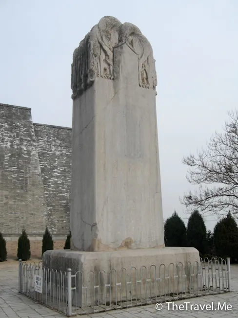 無字碑:「無字碑」位於墓前右邊(東),碑由一塊巨大的整石雕成,碑頭雕有8條互相纏繞的螭首,飾以天雲龍紋。根據乾陵建築對稱布局的特點,「無字碑」與述聖記碑是在高宗去世時由武則天同時主持豎立的,既然述聖記碑是讚頌高宗的,那「無字碑」自然就是武則天為自己準備的「功德碑」。