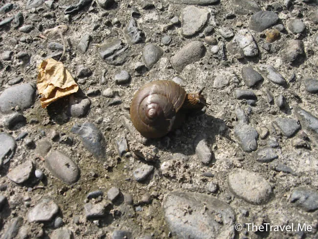 差點沒踩扁一隻正橫過馬路的蝸牛,但願它能平安過到對岸。