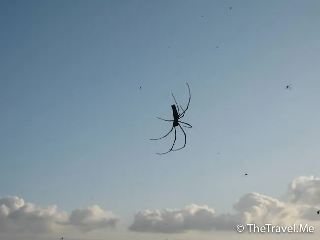 蝸牛不見了,天上卻懸浮著一隻特大蜘蛛,捕捉了很多有家歸不得的小昆蟲。