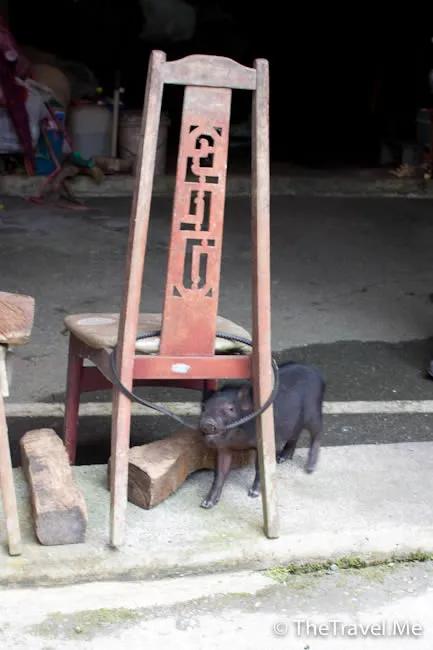 沿河向上再走十分鐘,便到了一個小市集,有各式賣土產和記念品的商店。當中最囑目的莫如某店家所養的小黑豬,據講這種小黑豬不會長大,故常用作當寵物,粗眉仔記得小時候在海南島亦見過這種小黑豬…