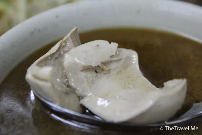 除了雞湯,這店還有雞腰湯和豬心湯,粗眉仔點了雞腰湯,雞腰爽嫩香脆,再點少少辣椒醬,正到暈!
