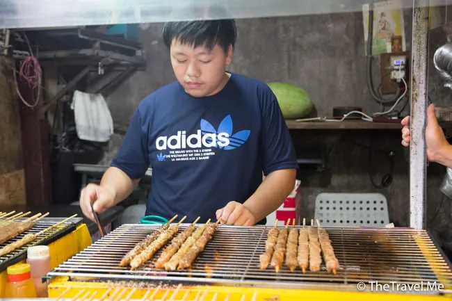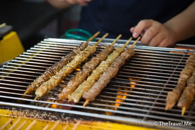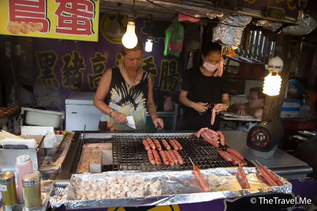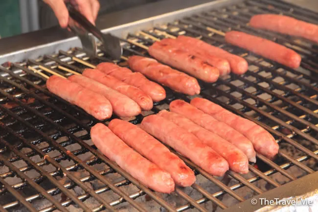 這檔山豬肉腸也是老街中比較出名的一家,剛才兩人老早就想吃台灣香腸了,不過翔太說這檔比較好,結果等到現在才吃。