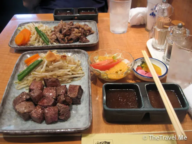 粗眉仔和公主山長水遠來這裏當然不是吃炸肉丸這麼簡單,店子旁有一道小門,小門通往二樓的牛扒店,這裏的鐵板燒松?牛(當然不是最高級那種)抵食夾大件,1250日元就有個150克的牛扒定食。