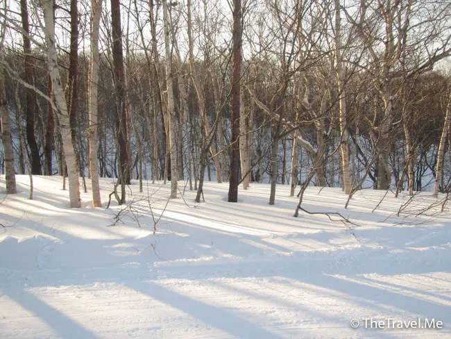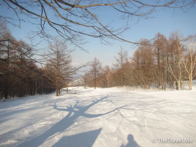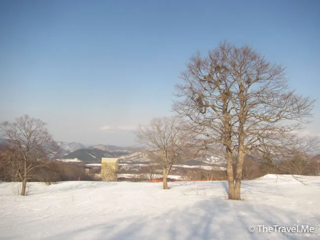 可能有不少遊客是盛岡人,明天還要上班,所以山上的遊人一下子少了很多。人少了,雖然有點寂寞,但雪地的風景極美,粗眉仔慢慢滑,慢慢欣賞。