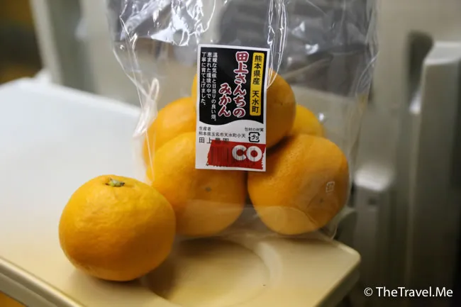 購物完畢,兩人轉乘另一部音速特急北上。一上車,豬豬便急不及待拆開剛才買來的「戰利品」,和歌山的蜜柑堪稱日本最佳,但沒想到,原來大分縣產的蜜柑也不錯,鮮甜多汁。