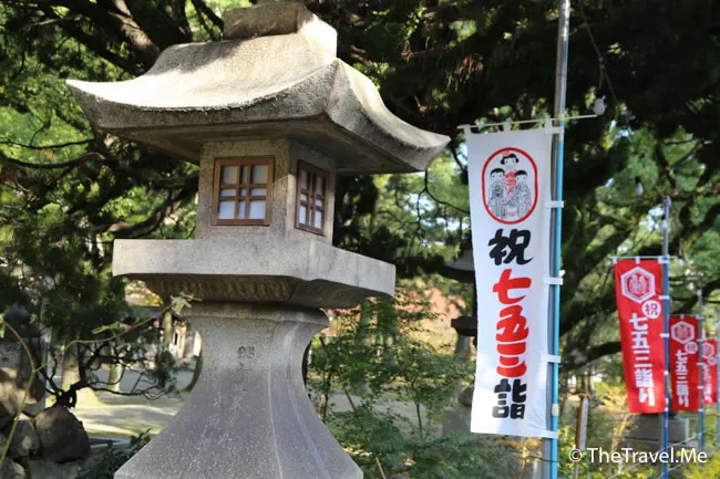神社內插滿寫著七五三的旗子,七五三節是日本的兒童節,嬰兒出生後三十至一百日內必須到神社參拜保護神,到了三歲(男女童)、五歲(男孩)和七歲(女孩)則要在每年的十一月十五日(明治維新前是農曆十一月十五)再去神社參拜,感謝神祇保佑之恩,並祈祝兒童能健康成長。