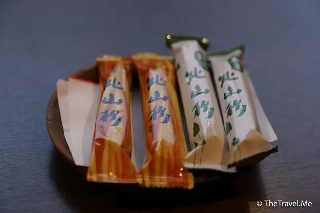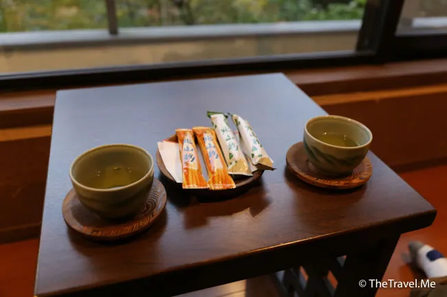 老婆婆跟著為兩人沏了一壼綠茶,還奉上送綠茶的點心,綠茶品質甚佳,令人精神為之一振。