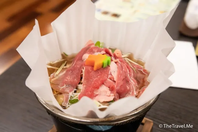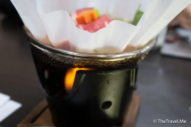 主菜是牛肉鍋,個鍋係用紙製造,比較特別,雖然保證安全,但睇見仍難免有點點心驚。