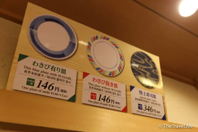 壽司選擇不多,而且只有兩種價錢,分別係146円和346円,用的是空心顏色碟和實心顏色碟,非常好認。