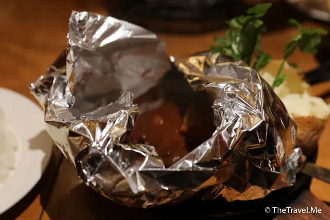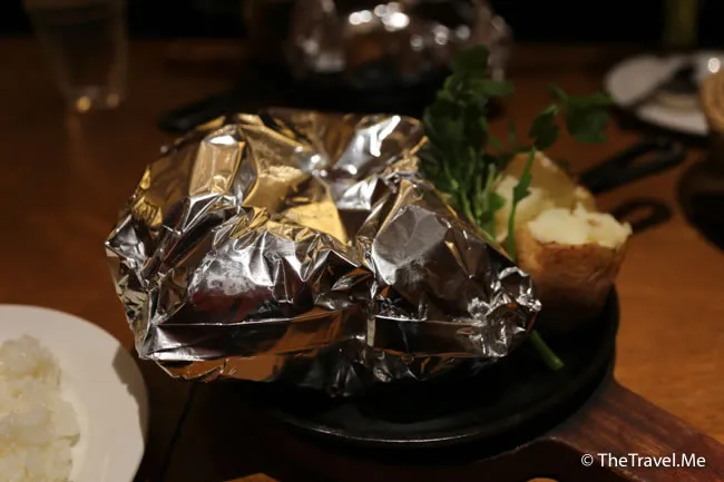 配菜有一個牛油焗薯仔,薯仔可以連皮食,沾上漢堡扒的汁更加好味。