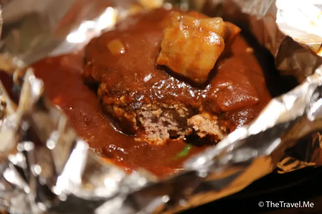 主菜漢堡扒用錫紙包裹,保持溫熱,食落多汁鮮味,配上日本的優質米飯,堪稱絕配。