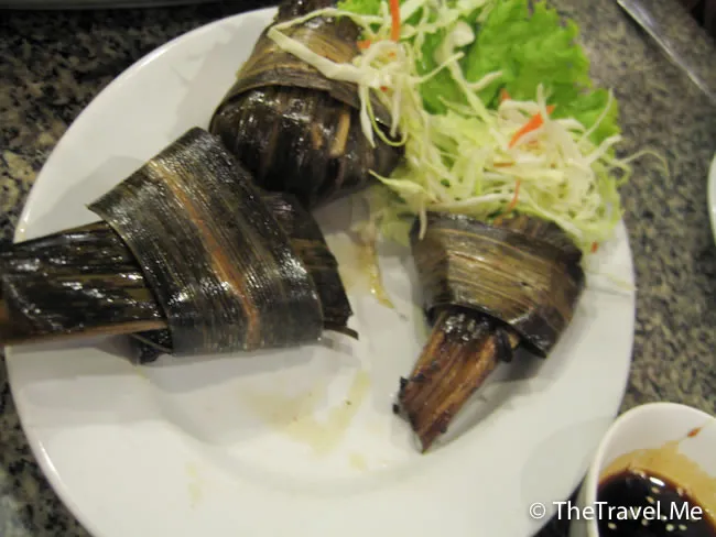 Pandan 葉炸雞,這塊葉不只是裝飾,還會將本身香味滲透到雞肉上,呢種Pandan葉在東南亞是烹飪常客,菲律賓同印尼都用此來增加食物香味。
