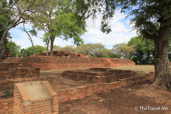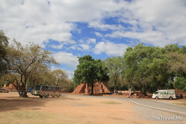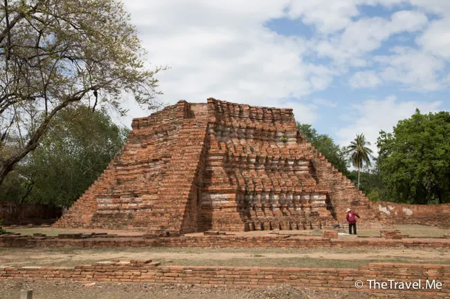 臥佛後面有個殘存佛塔,但佛塔周邊幾給緬甸人破壞殆盡,遠看只餘一條寂寞的「柱子」,令人慘不忍睹。