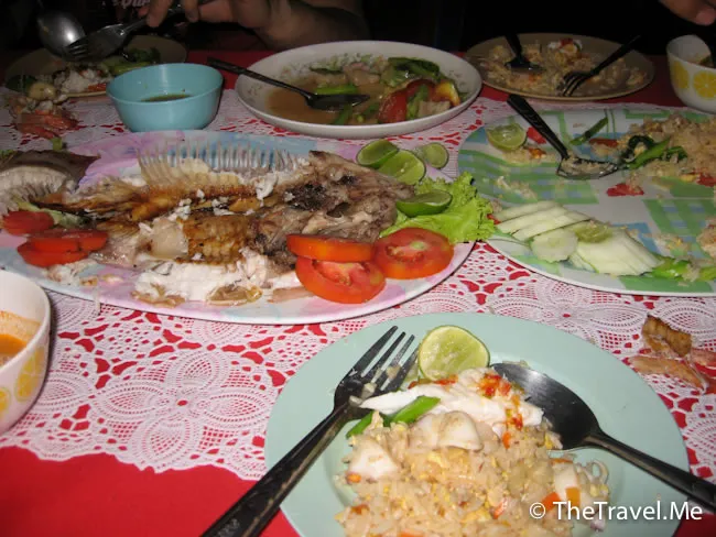 為大家介紹,五個人共點了一條大烤魚、兩碟泰式炒菜、兩大碗海鮮冬蔭功、兩大碟海鮮炒飯、炒蜆和烤魷魚等。