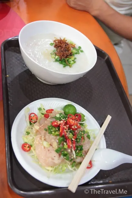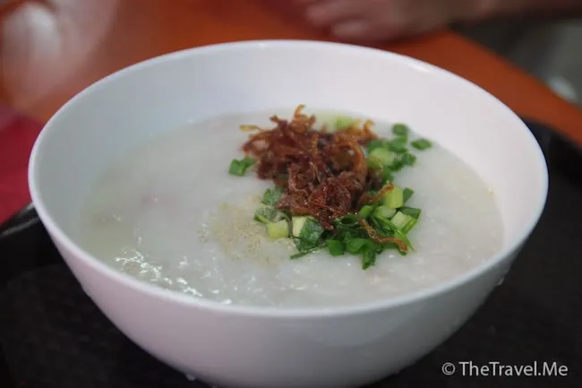 臨走時,見某粥店門外有很多人排隊,料想應是名店,便買了兩碗粥試試。一吃發現果然不是浪得虛名,粥底又綿又厚,啖啖米香,但如果不是加了少許味精,風味會更佳。