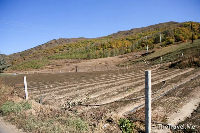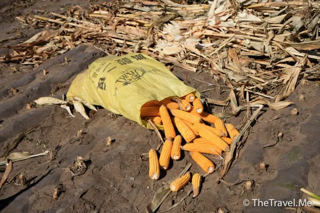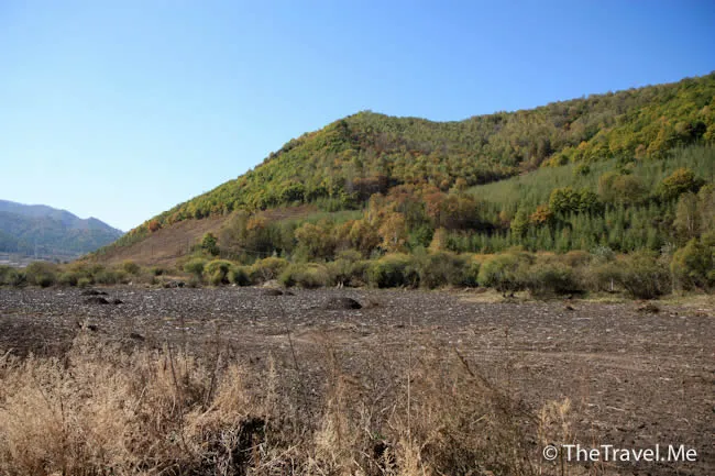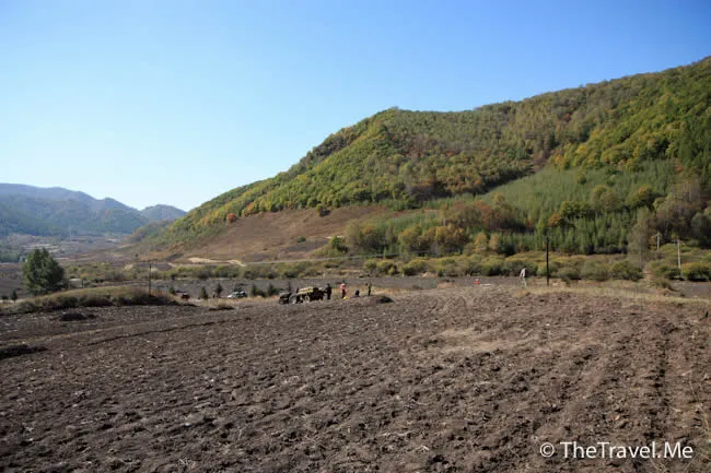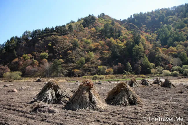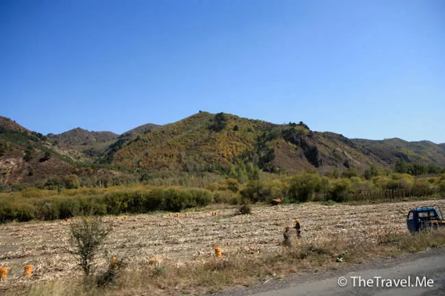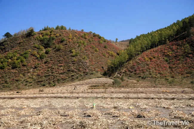 短短幾天,這裏已換了幅截然不同的畫卷。田裏的玉米桿不見了,山頭給染紅了。