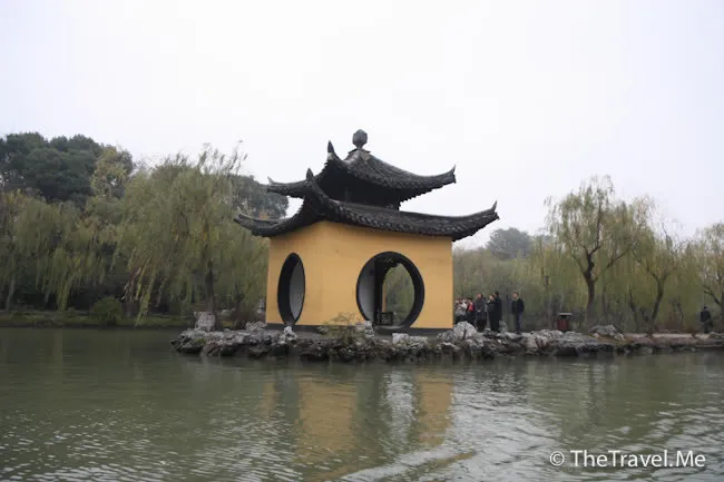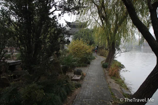兩人離開白塔後繼續沿湖邊小路往熙春樓走,中途見對面有個人工小洲,便過橋到洲上看看。
