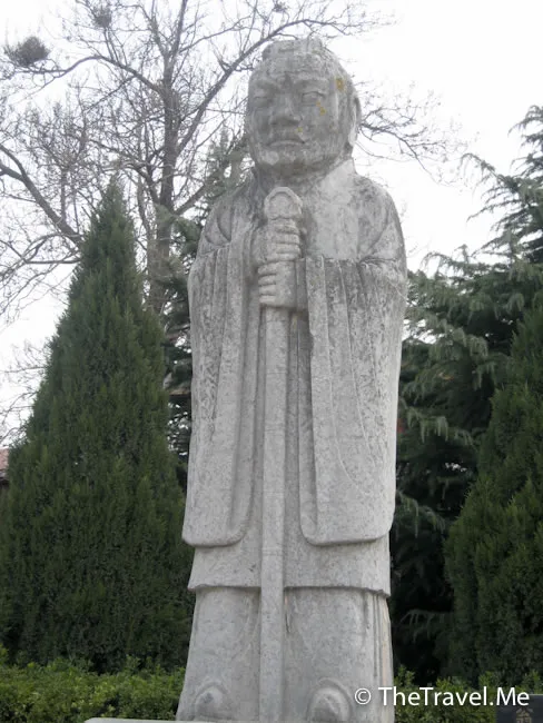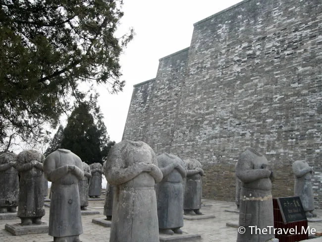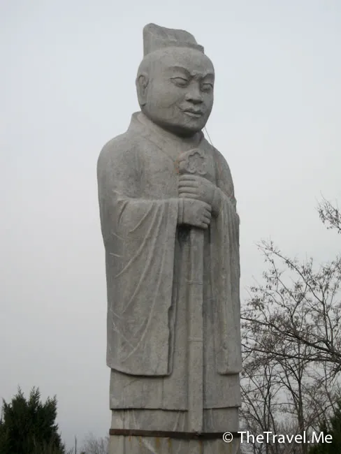 翁仲:陵墓前的石��又稱翁仲,對稱立有兩座,分別為文官和武官形象。關於翁仲的形象有一種說法是來源於秦朝有一位名叫阮翁仲的大力士,傳說他身長一丈三尺,力大無比,曾駐守臨洮,征服匈奴有功。他死後,秦始皇特製翁仲銅像立於咸陽宮司馬門外。匈奴人來咸陽,見到銅人,竟為是活著的阮翁仲而逃遁。從此,人們便把宮闕或陵墓前的銅人、石人稱為翁仲。