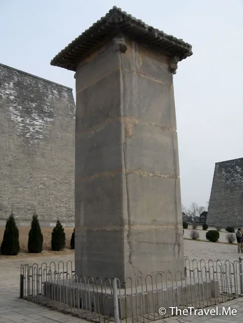 無字碑:「無字碑」位於墓前右邊(東),碑由一塊巨大的整石雕成,碑頭雕有8條互相纏繞的螭首,飾以天雲龍紋。根據乾陵建築對稱布局的特點,「無字碑」與述聖記碑是在高宗去世時由武則天同時主持豎立的,既然述聖記碑是讚頌高宗的,那「無字碑」自然就是武則天為自己準備的「功德碑」。