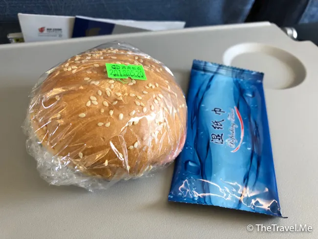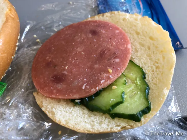 飛行途中,空中少爺派發一件聲稱是「牛肉漢堡」的東西,打開麵包,但見一片粉紅色的火腿狀物體,好明顯改錯名,這東西應該叫「牛肉恐怖」才對。
