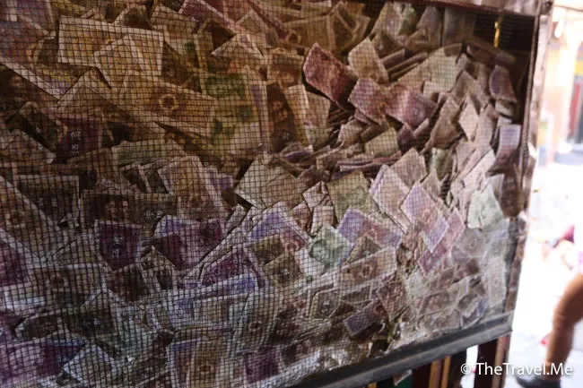 天台上有個小殿,殿內也掛滿銀紙人仔,庸俗不堪,粗眉仔真想問:這些人是信錢還是信佛?