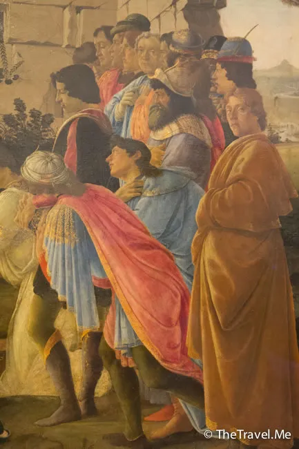 畫中人物的形象主要金主麥地奇家族的主要人物。最右面看向觀者的黃衣青年正是畫家本人。