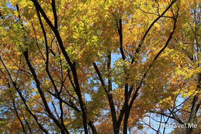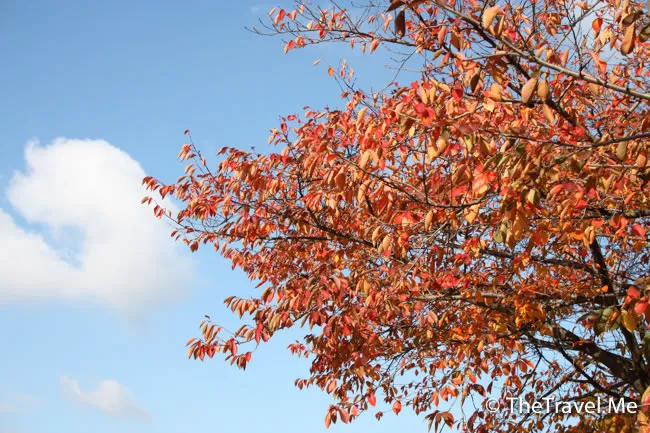 陽光照耀下,樹影是紅橙黃中夾雜青綠,濃淡相宜,顏色豐富而不亂,非常迷人。