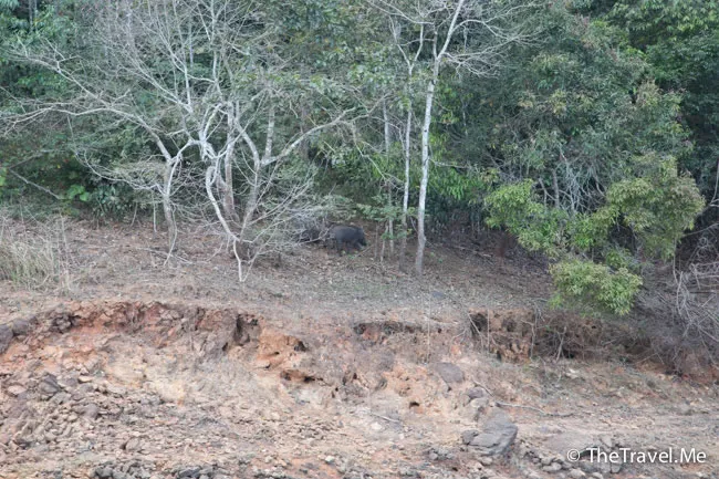 岸邊忽然傳來一些奇怪的聲響,船上所有人一齊望過去,原來是幾頭野豬,由於距離近,野豬有點兒怕羞,很快便消失不見了。