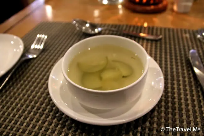 粗眉仔今餐最喜歡的,是名為「青瓜芫茜檸檬湯」的餐湯,清淡鮮味,而且酸酸的十分開胃,適合天熱時飲用。
