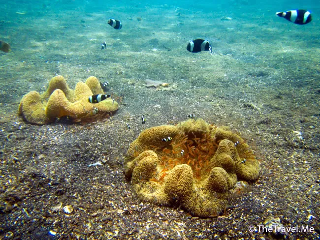海葵上寄生著一些小蝦,小蝦的顏色較深,粗眉仔看得清清楚楚。